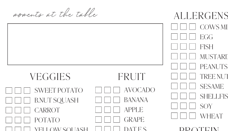Track your appointments with the printable calendar. Complete with our signature untitled list with plenty of room for your monthly musings. In addition a list of 100+ foods to track your babies first foods and help with meal planning!